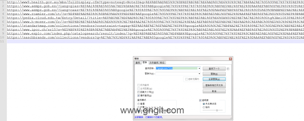 我们想去除掉这些从谷歌提取出来的都含有google域名的不同后面字符的网址URL,今天演示两种办法来解决这个问题,不用其余的很高级的软件,一个用notepad++就可以了,另外一个用在线的TXT处理网站就可以