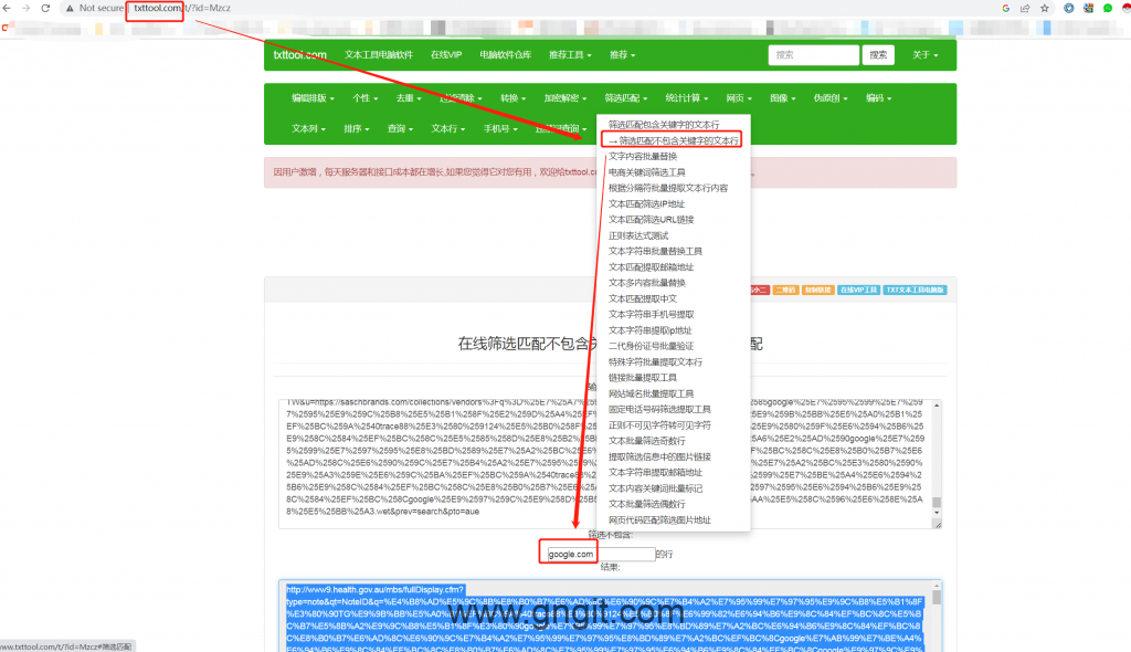 第二种办法:百度:在线筛选匹配不包含关键字的文本行,选一个TXT在线处理的网站:
