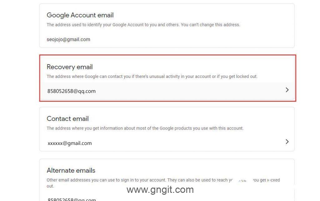 Google邮箱注册时都需要增加辅助邮箱,主要用于账号密码找回,辅助异常登录解封等功能。那么如果是购买的google邮箱,绑定别人的辅助邮箱心里不踏实,那么怎么修改谷歌邮箱的辅助邮箱呢?GNGIT今天给大家带来详细的Gmail谷歌账号更改辅助邮箱的教程。