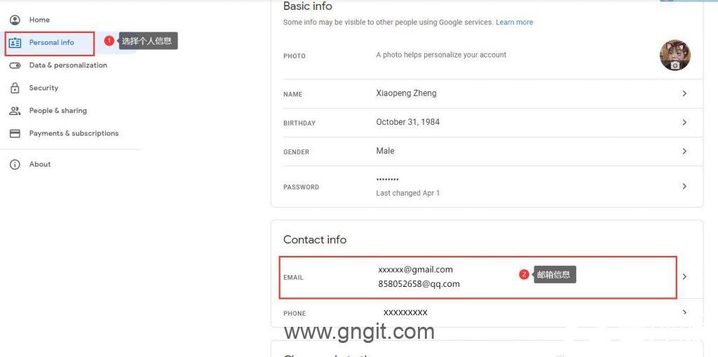 2、登录账号之后,选择“Personal info”,找到“Contact info”下面的“email”点进去;如下图所示:
