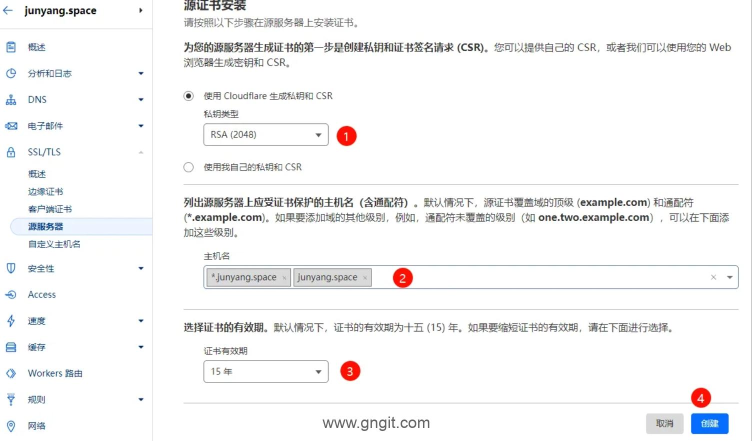 点击左侧菜单”SSL/TLS“下面的”源服务器“,选择”创建证书“
